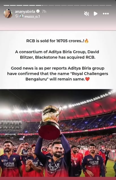 But Ananya Birla has a clear message for the loyal RCB fanbase. Ananya Birla shared an Insta story which reads: “RCB is sold for 16705 crores. A consortium of Aditya Birla Group, David Blitzer, and Blackstone has acquired the RCB. The good news is as per the reports, the Aditya Birla Group has confirmed that the name ‘Royal Challengers Bengaluru’ will remain the same.”