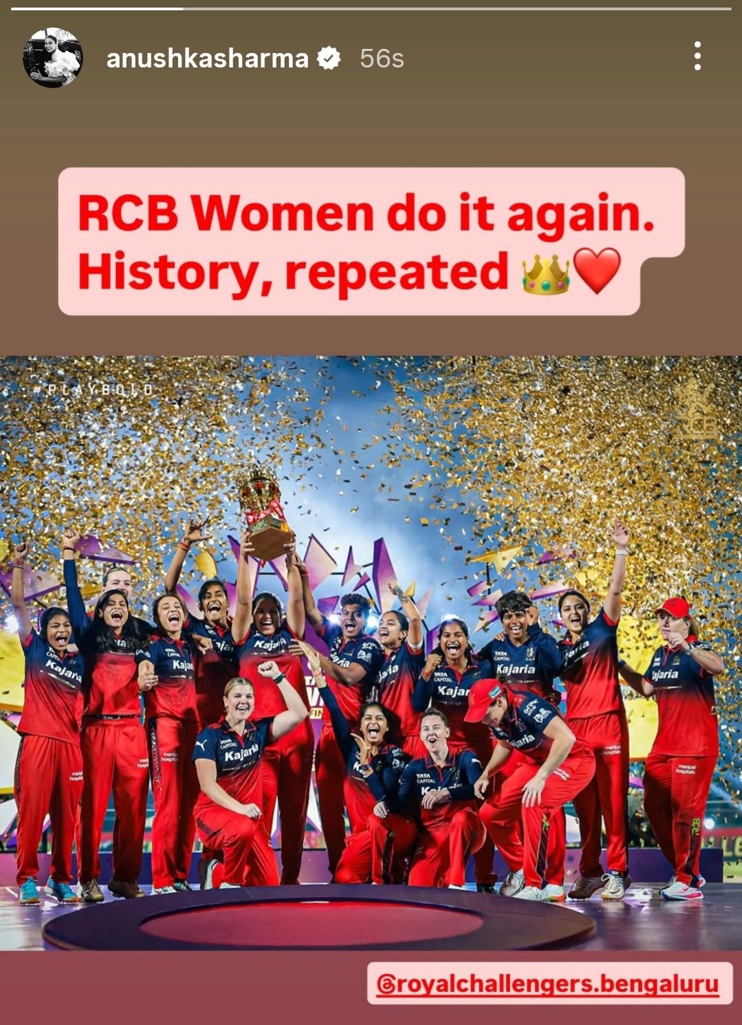 Kohli’s wife and Bollywood actress, Anushka Sharma, was also caught up in the joy of the moment. She shared a photo of the victorious RCB women on her Instagram story, celebrating the repeat of history and the team’s WPL 2026 glory.