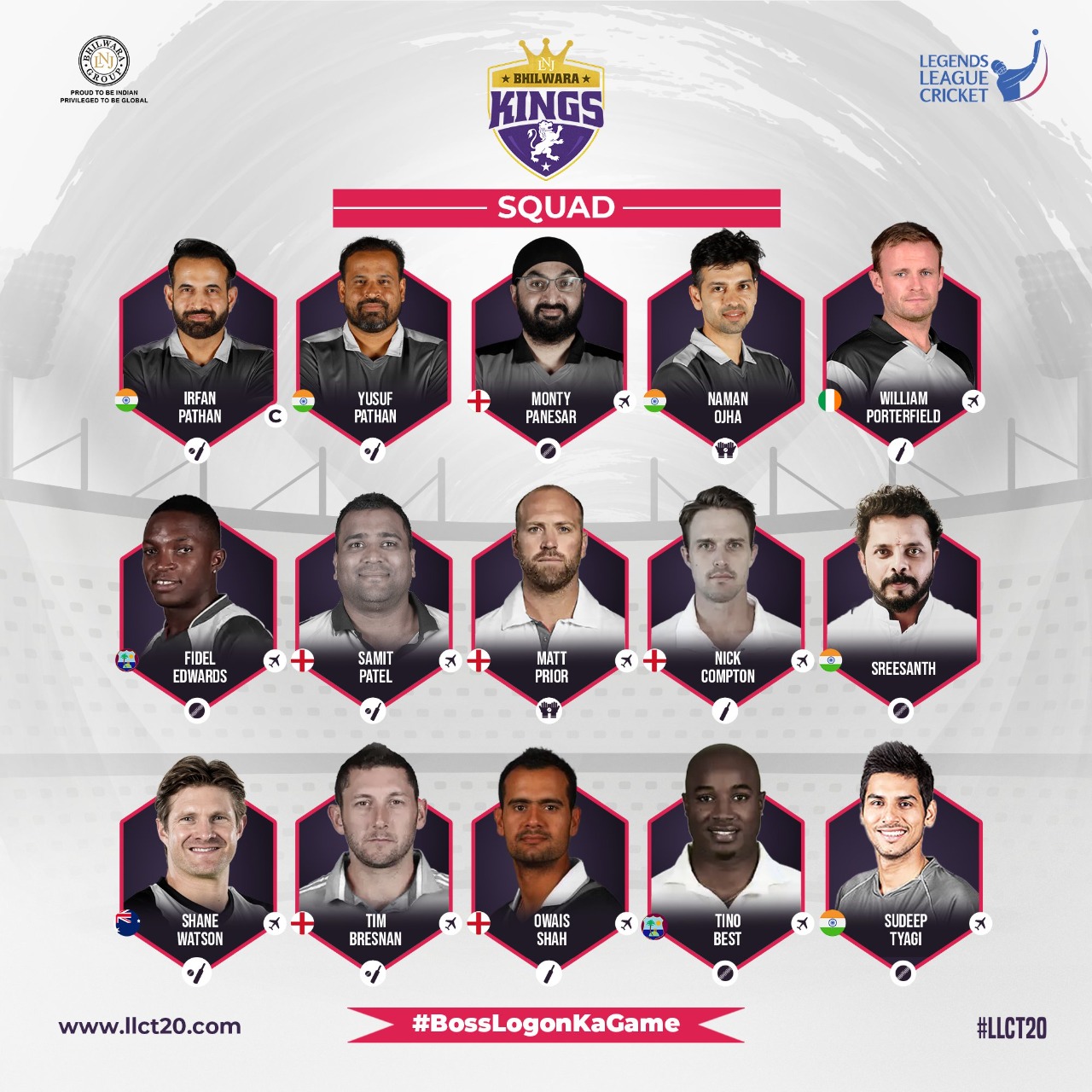 Bhilwara Kings: Irfan Pathan (Captain), Yusuf Pathan,Sudeep Tyagi, Tino Best, Owais Shah, Tim Bresnan, Shane Watson, Sreesanth, Nick Compton, Matt Prior, Samit Patel, Fidel Edwards, William Porterfield, Naman Ojha, Monty Panesar.