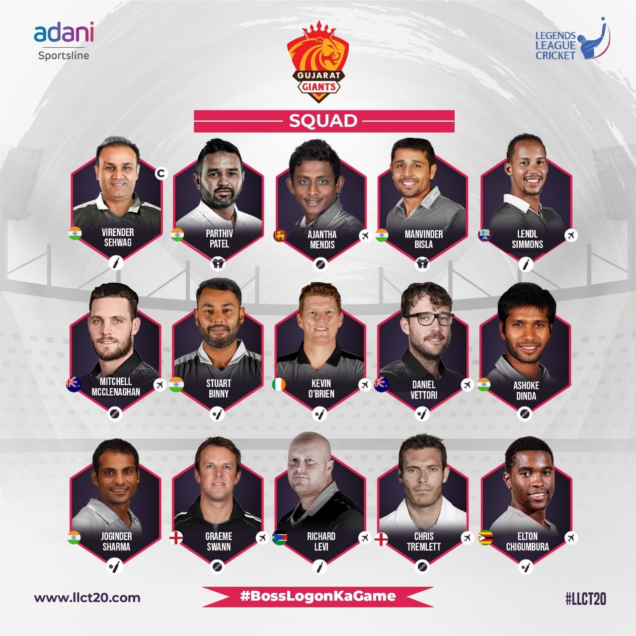 Gujarat Giants: Virender Sehwag (Captain) Parthiv Patel; Elton Chigumbura; Chris Tremlett; Richard Levi; Graeme Swann; Joginder Sharma; Ashoke Dinda; Daniel Vettori; Kevin O’brien; Stuart Binny; Mitchell Mcclenaghan; Lendl Simmons; Manvinder Bisla; Ajantha Mendis
