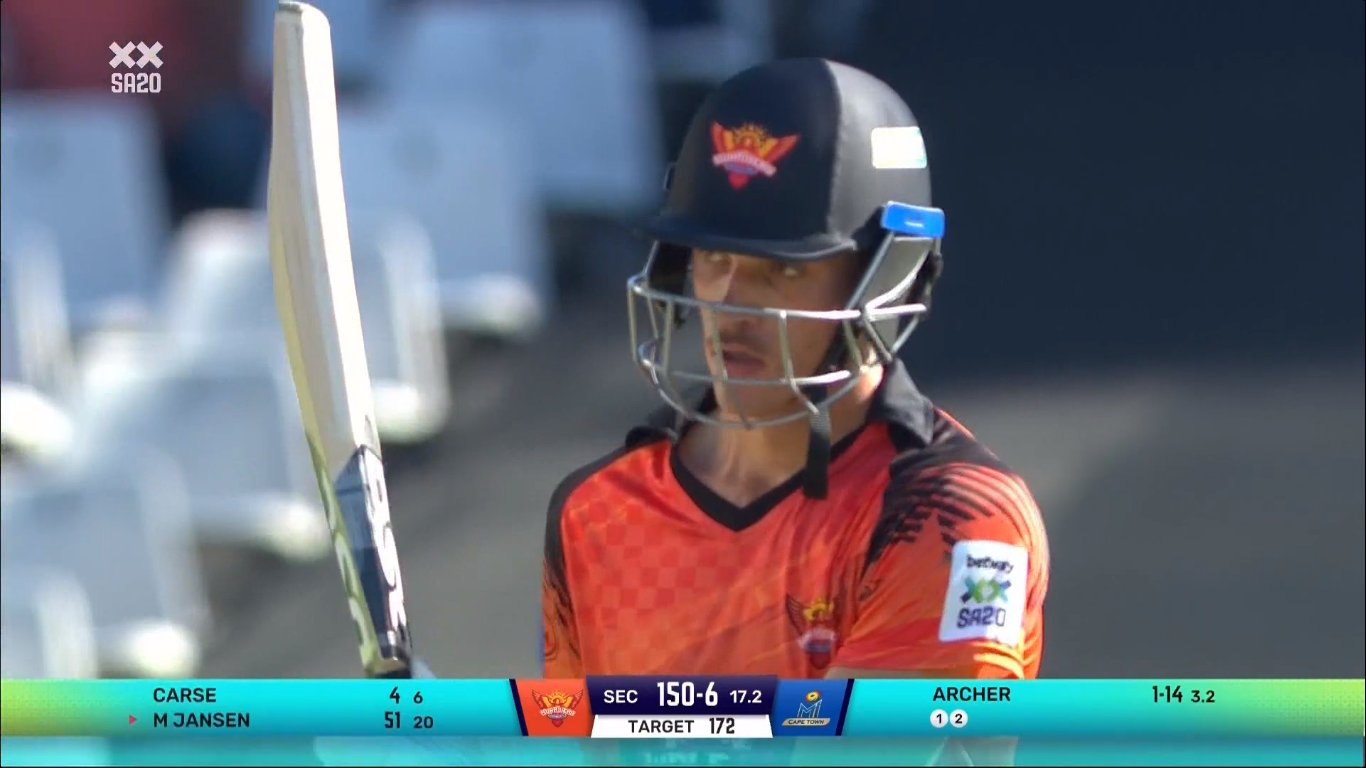 Sunrisers Eastern Cape registered their second consecutive win in SA20 as Marco Jansen turned up the heat with the bat in his hand leading the side to an exciting two-wicket win. Chasing 172, Jansen came in when his team needed 81 in less than eight overs. The lanky South African launched a fiery counterattack laced with seven sixes and three fours including 28 runs in a single over of MI Cape Town skipper and one of the best T20 exponents, Rashid Khan.