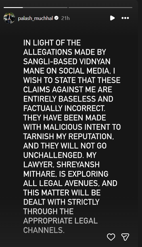 Palash posted on Instagram: “In light of the allegations made by Sangli-based Vidnyan Mane on social media, I wish to state that these claims against me are entirely baseless and factually incorrect. They have been made with malicious intent to tarnish my reputation, and they will not go unchallenged. My lawyer, Shreyansh Mithare, is exploring all legal avenues, and this matter will be dealt with strictly through the appropriate legal channels.”