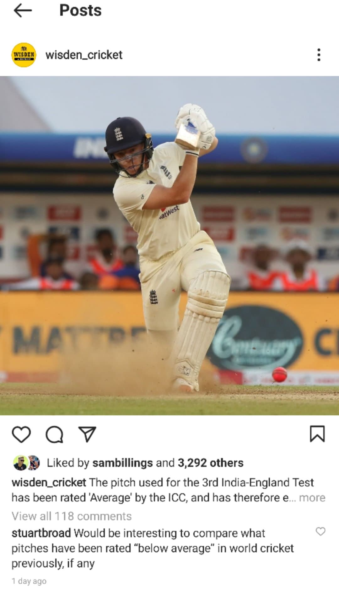 Meanwhile, Stuart Broad took a dig on a post of Wisden Cricket on Instagram, knowing the Ahmedabad’s pitch earned an average rating. The 34-year old stated he would like to know what pitches were rated below average, if there is any in world cricket. Broad’s exact comment was “Would be interesting to compare what pitches have been rated “below average” in world cricket previously, if any”.
