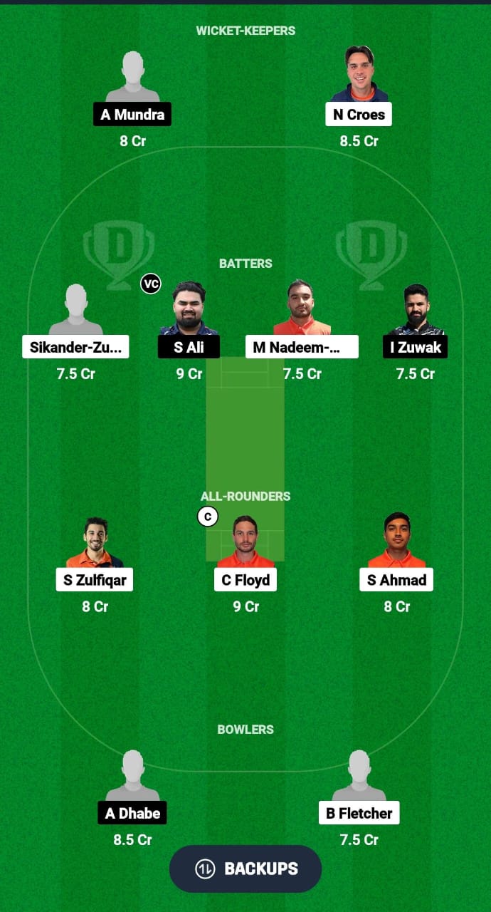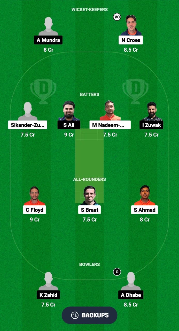 Netherlands XI Playing 11: Clayton Floyd, Musa Ahmed, Noah Croes(wk), Teun Leijer, Saqib Zulfiqar, Sikander Zulfiqar, Sebastiaan Braat©, Shariz Ahmad, Olivier Elenbaas, Arnav Jain, Ben Fletcher